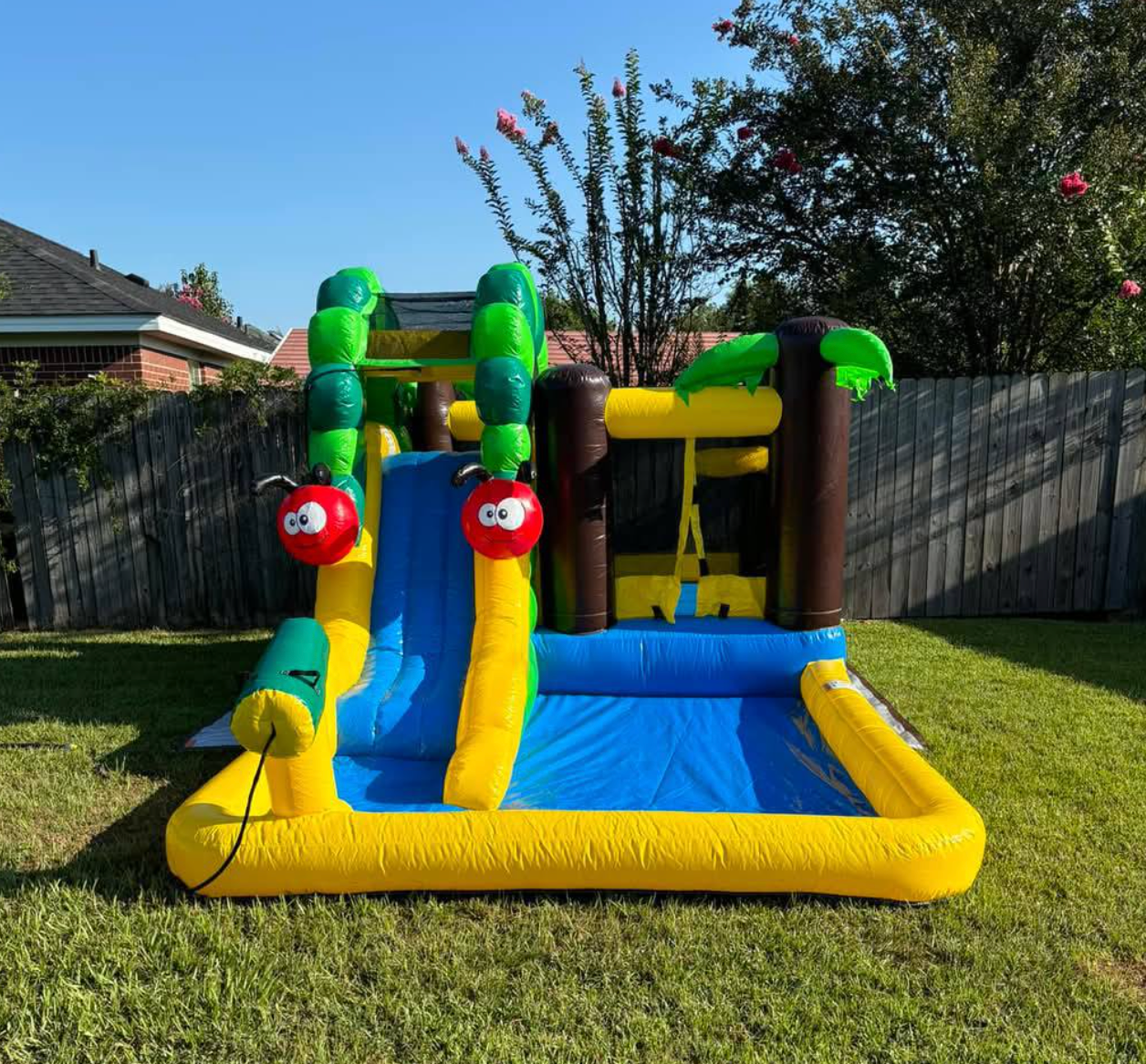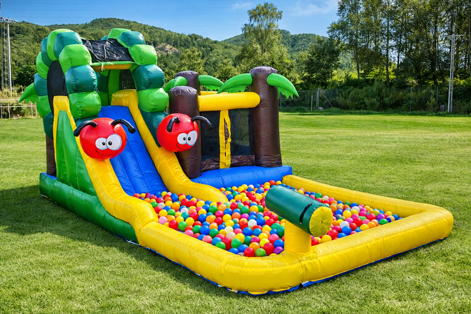 Bring colorful excitement to your next event with our Caterpillar Jungle Inflatable with Ball Pit! Designed with vibrant jungle colors, playful caterpillar details, and palm-tree accents, this inflatable instantly turns any backyard into a fun-filled adventure zone.